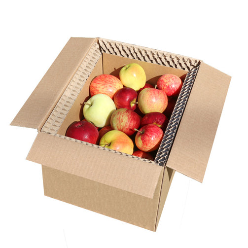 Die Auswahl von 3 alten Obstsorten versenden wir in der Kartonkiste mit Luftpölstern zum Schutz gegen Erschütterungen. Wir sind stolz darauf, dass dieses Produkt, wie alle anderen auch, ohne Plastik auskommt.